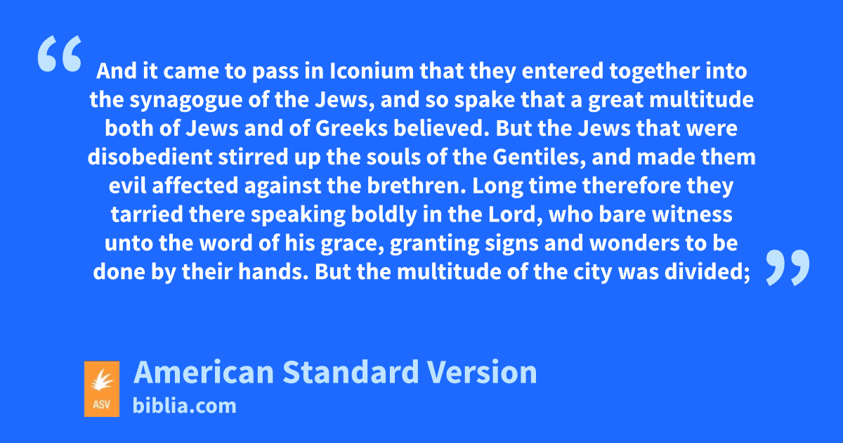 14 And it came to pass in Iconium that they entered together into the synagogue of the Jews, and so spake that a great multitude both of Jews and of Greeks believed. 2But the Jews that were disobedient stirred up the souls of the Gentiles, and made them evil affected against the brethren. 3Long time therefore they tarried there speaking boldly in the Lord, who bare witness unto the word of his grace, granting signs and wonders to be done by their hands. 4But the multitude of the city was divided; and part held with the Jews, and part with the apostles. 5And when there was made an onset both of the Gentiles and of the Jews with their rulers, to treat them shamefully and to stone them, 6they became aware of it, and fled unto the cities of Lycaonia, Lystra and Derbe, and the region round about: 7and there they preached the gospel.