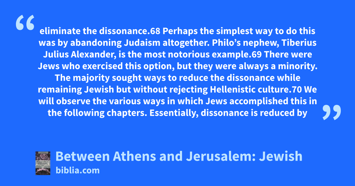 eliminate the dissonance.68 Perhaps the simplest way to do this was by abandoning Judaism altogether. Philo’s nephew, Tiberius Julius Alexander, is the most notorious example.69 There were Jews who exercised this option, but they were always a minority. The majority sought ways to reduce the dissonance while remaining Jewish but without rejecting Hellenistic culture.70 We will observe the various ways in which Jews accomplished this in the following chapters. Essentially, dissonance is reduced by