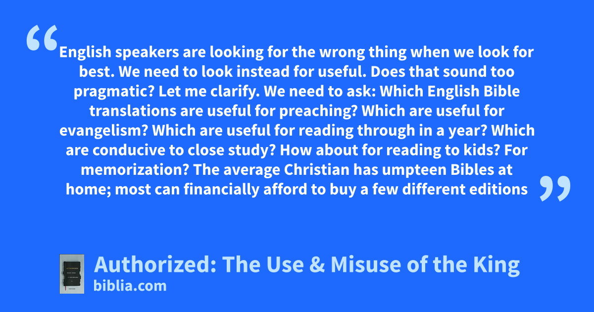 English speakers are looking for the wrong thing when we look for best. We need to look instead for useful. Does that sound too pragmatic? Let me clarify. We need to ask: Which English Bible translations are useful for preaching? Which are useful for evangelism? Which are useful for reading through in a year? Which are conducive to close study? How about for reading to kids? For memorization? The average Christian has umpteen Bibles at home; most can financially afford to buy a few different editions