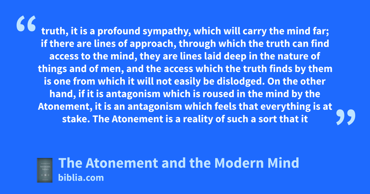 truth, it is a profound sympathy, which will carry the mind far; if there are lines of approach, through which the truth can find access to the mind, they are lines laid deep in the nature of things and of men, and the access which the truth finds by them is one from which it will not easily be dislodged. On the other hand, if it is antagonism which is roused in the mind by the Atonement, it is an antagonism which feels that everything is at stake. The Atonement is a reality of such a sort that it