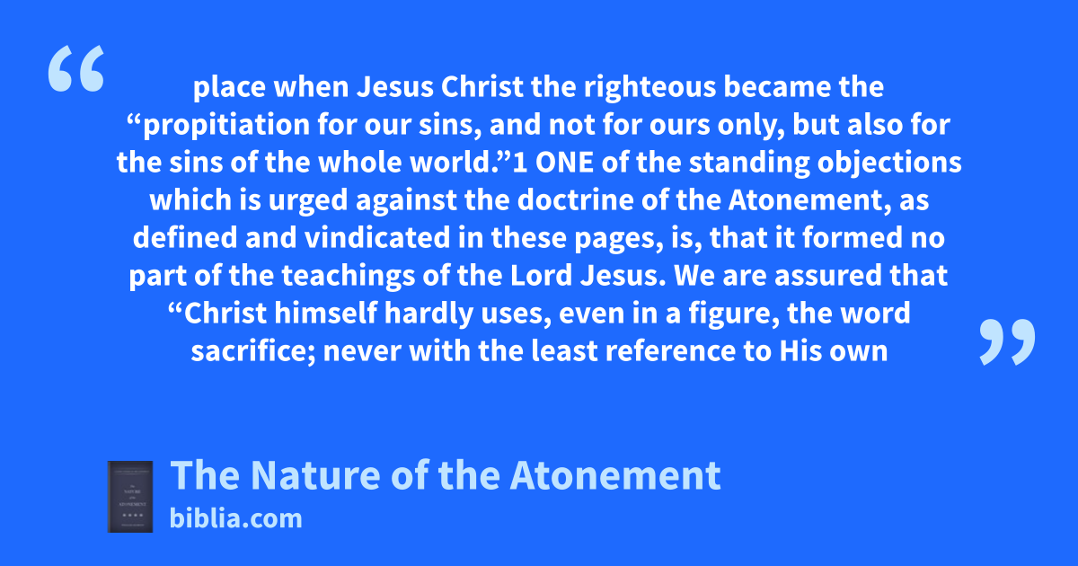 place when Jesus Christ the righteous became the “propitiation for our sins, and not for ours only, but also for the sins of the whole world.”1 ONE of the standing objections which is urged against the doctrine of the Atonement, as defined and vindicated in these pages, is, that it formed no part of the teachings of the Lord Jesus. We are assured that “Christ himself hardly uses, even in a figure, the word sacrifice; never with the least reference to His own