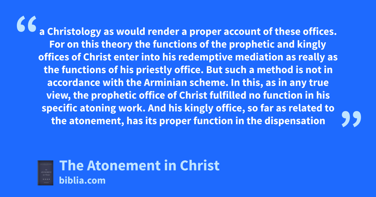 The atonement may be treated in a broader or in a more restricted sense. In the former sense, it may include the whole of soteriology, while in the latter it may be treated specially as the ground of justification, or the forgiveness of sin. In each case the comprehension is logically determined by cardinal doctrines of the system in connection with which the subject is treated. After determining...
