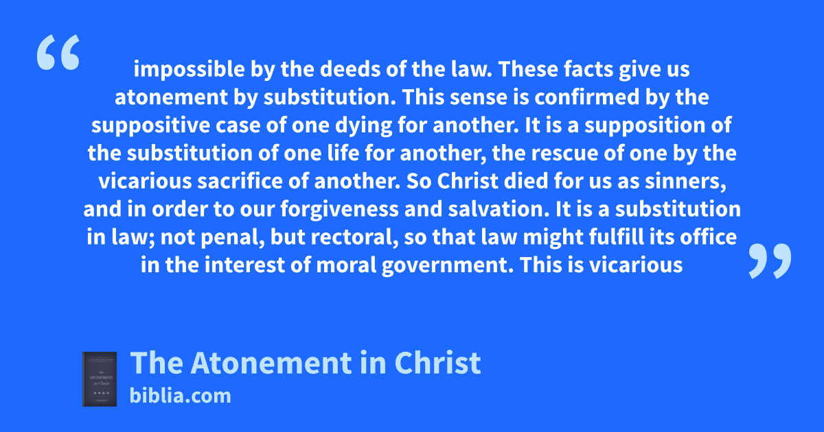 impossible by the deeds of the law. These facts give us atonement by substitution. This sense is confirmed by the suppositive case of one dying for another. It is a supposition of the substitution of one life for another, the rescue of one by the vicarious sacrifice of another. So Christ died for us as sinners, and in order to our forgiveness and salvation. It is a substitution in law; not penal, but rectoral, so that law might fulfill its office in the interest of moral government. This is vicarious