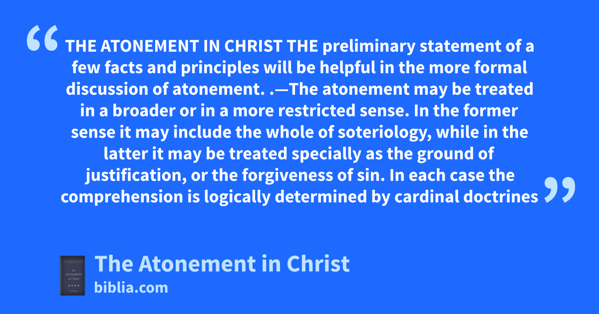 THE ATONEMENT IN CHRIST THE preliminary statement of a few facts and principles will be helpful in the more formal discussion of atonement. .—The atonement may be treated in a broader or in a more restricted sense. In the former sense it may include the whole of soteriology, while in the latter it may be treated specially as the ground of justification, or the forgiveness of sin. In each case the comprehension is logically determined by cardinal doctrines