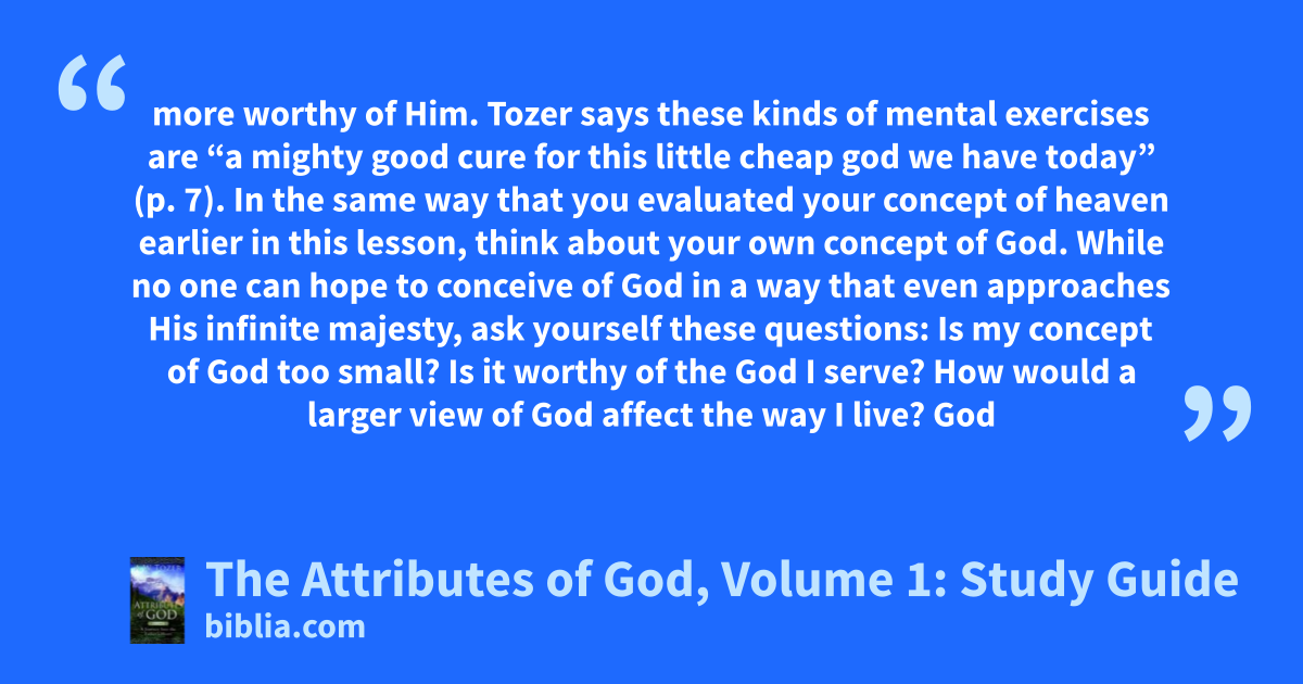 more worthy of Him. Tozer says these kinds of mental exercises are “a mighty good cure for this little cheap god we have today” (p. 7). In the same way that you evaluated your concept of heaven earlier in this lesson, think about your own concept of God. While no one can hope to conceive of God in a way that even approaches His infinite majesty, ask yourself these questions: Is my concept of God too small? Is it worthy of the God I serve? How would a larger view of God affect the way I live? God
