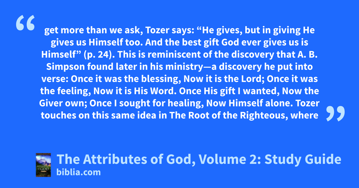 get more than we ask, Tozer says: “He gives, but in giving He gives us Himself too. And the best gift God ever gives us is Himself” (p. 24). This is reminiscent of the discovery that A. B. Simpson found later in his ministry—a discovery he put into verse: Once it was the blessing, Now it is the Lord; Once it was the feeling, Now it is His Word. Once His gift I wanted, Now the Giver own; Once I sought for healing, Now Himself alone. Tozer touches on this same idea in The Root of the Righteous, where
