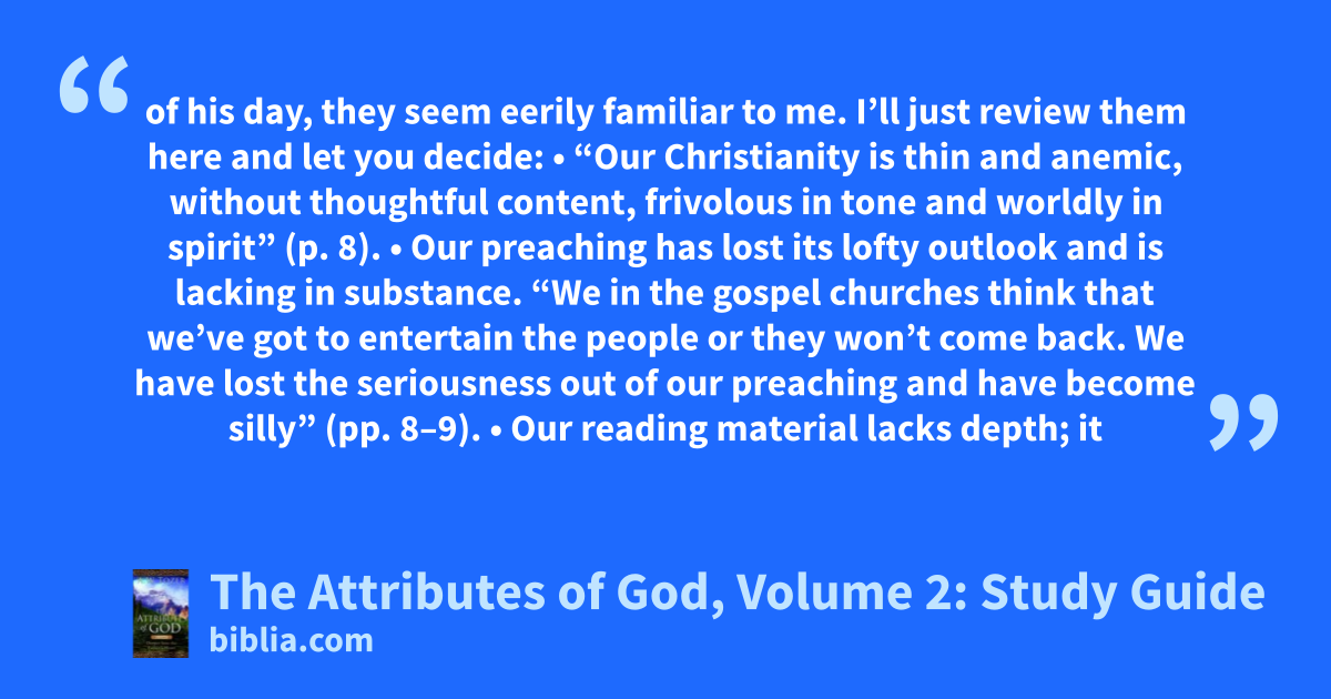 of his day, they seem eerily familiar to me. I’ll just review them here and let you decide: • “Our Christianity is thin and anemic, without thoughtful content, frivolous in tone and worldly in spirit” (p. 8). • Our preaching has lost its lofty outlook and is lacking in substance. “We in the gospel churches think that we’ve got to entertain the people or they won’t come back. We have lost the seriousness out of our preaching and have become silly” (pp. 8–9). • Our reading material lacks depth; it