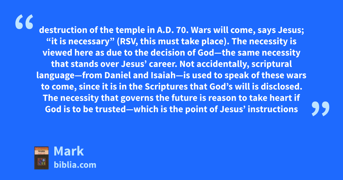 destruction of the temple in A.D. 70. Wars will come, says Jesus; “it is necessary” (RSV, this must take place). The necessity is viewed here as due to the decision of God—the same necessity that stands over Jesus’ career. Not accidentally, scriptural language—from Daniel and Isaiah—is used to speak of these wars to come, since it is in the Scriptures that God’s will is disclosed. The necessity that governs the future is reason to take heart if God is to be trusted—which is the point of Jesus’ instructions