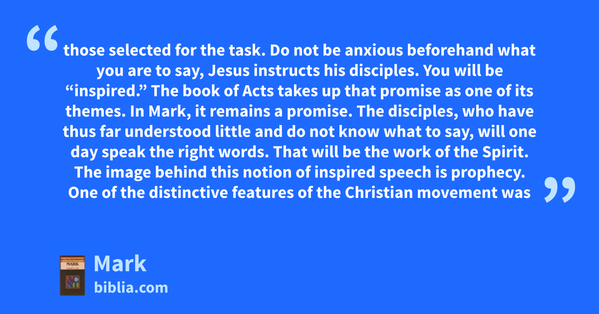 those selected for the task. Do not be anxious beforehand what you are to say, Jesus instructs his disciples. You will be “inspired.” The book of Acts takes up that promise as one of its themes. In Mark, it remains a promise. The disciples, who have thus far understood little and do not know what to say, will one day speak the right words. That will be the work of the Spirit. The image behind this notion of inspired speech is prophecy. One of the distinctive features of the Christian movement was
