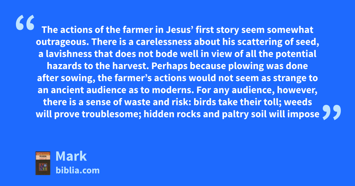 The actions of the farmer in Jesus’ first story seem somewhat outrageous. There is a carelessness about his scattering of seed, a lavishness that does not bode well in view of all the potential hazards to the harvest. Perhaps because plowing was done after sowing, the farmer’s actions would not seem as strange to an ancient audience as to moderns. For any audience, however, there is a sense of waste and risk: birds take their toll; weeds will prove troublesome; hidden rocks and paltry soil will impose