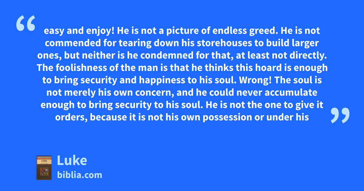 easy and enjoy! He is not a picture of endless greed. He is not commended for tearing down his storehouses to build larger ones, but neither is he condemned for that, at least not directly. The foolishness of the man is that he thinks this hoard is enough to bring security and happiness to his soul. Wrong! The soul is not merely his own concern, and he could never accumulate enough to bring security to his soul. He is not the one to give it orders, because it is not his own possession or under his