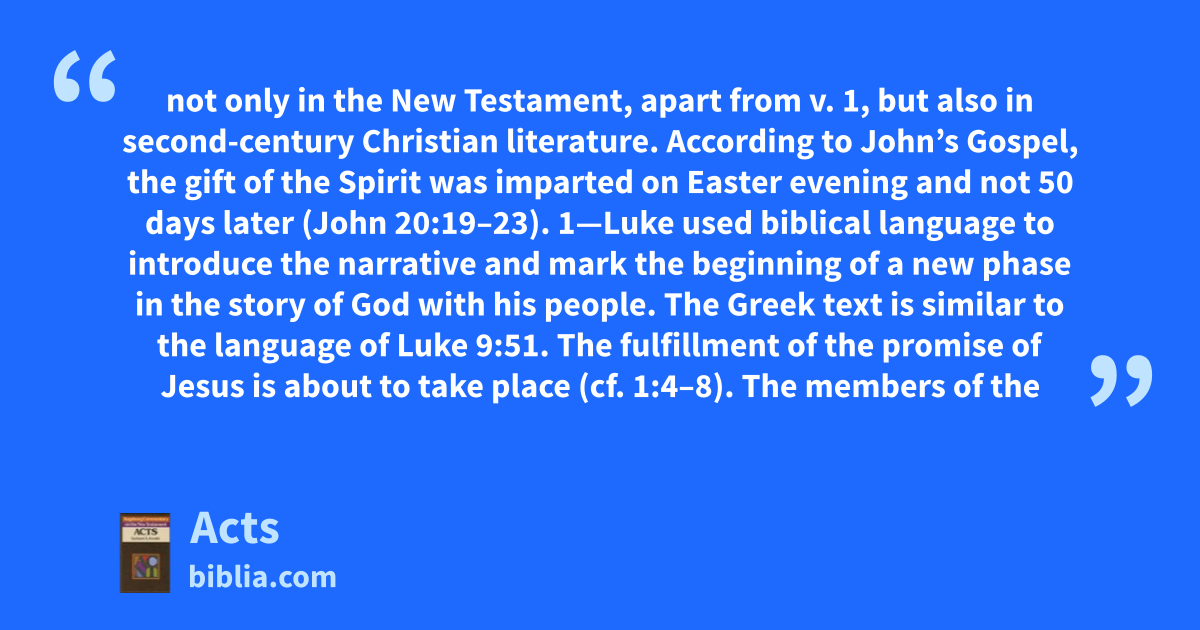 not only in the New Testament, apart from v. 1, but also in second-century Christian literature. According to John’s Gospel, the gift of the Spirit was imparted on Easter evening and not 50 days later (John 20:19–23). 1—Luke used biblical language to introduce the narrative and mark the beginning of a new phase in the story of God with his people. The Greek text is similar to the language of Luke 9:51. The fulfillment of the promise of Jesus is about to take place (cf. 1:4–8). The members of the