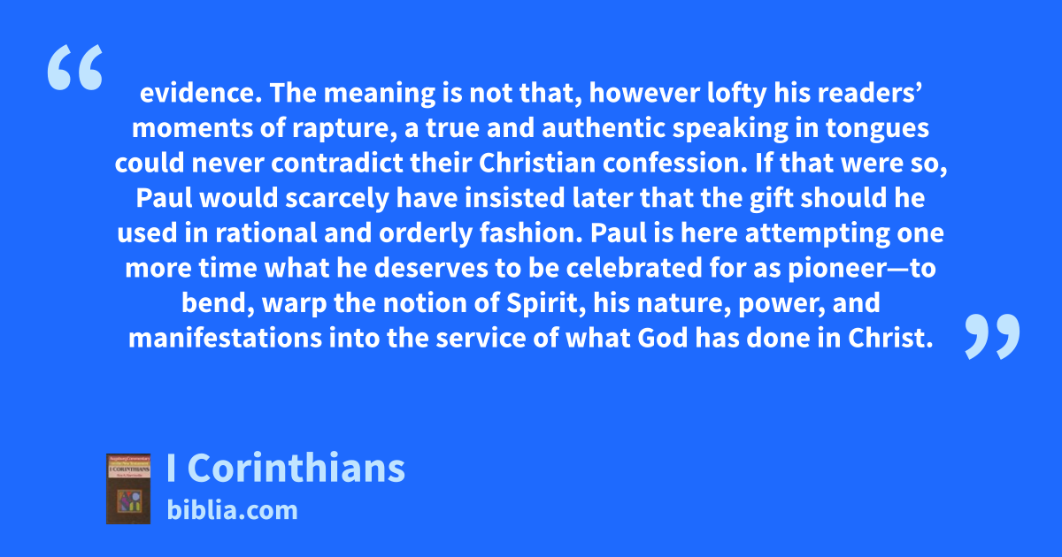 evidence. The meaning is not that, however lofty his readers’ moments of rapture, a true and authentic speaking in tongues could never contradict their Christian confession. If that were so, Paul would scarcely have insisted later that the gift should he used in rational and orderly fashion. Paul is here attempting one more time what he deserves to be celebrated for as pioneer—to bend, warp the notion of Spirit, his nature, power, and manifestations into the service of what God has done in Christ.
