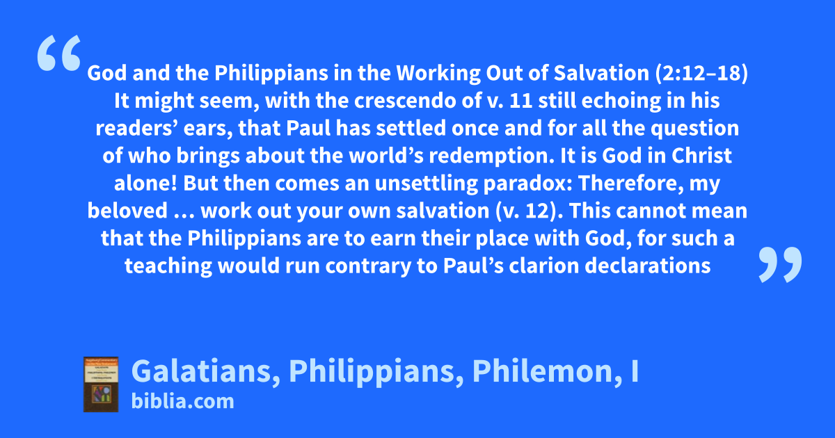 God and the Philippians in the Working Out of Salvation (2:12–18) It might seem, with the crescendo of v. 11 still echoing in his readers’ ears, that Paul has settled once and for all the question of who brings about the world’s redemption. It is God in Christ alone! But then comes an unsettling paradox: Therefore, my beloved … work out your own salvation (v. 12). This cannot mean that the Philippians are to earn their place with God, for such a teaching would run contrary to Paul’s clarion declarations