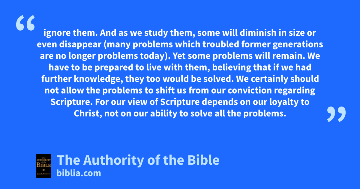 ignore them. And as we study them, some will diminish in size or even disappear (many problems which troubled former generations are no longer problems today). Yet some problems will remain. We have to be prepared to live with them, believing that if we had further knowledge, they too would be solved. We certainly should not allow the problems to shift us from our conviction regarding Scripture. For our view of Scripture depends on our loyalty to Christ, not on our ability to solve all the problems.