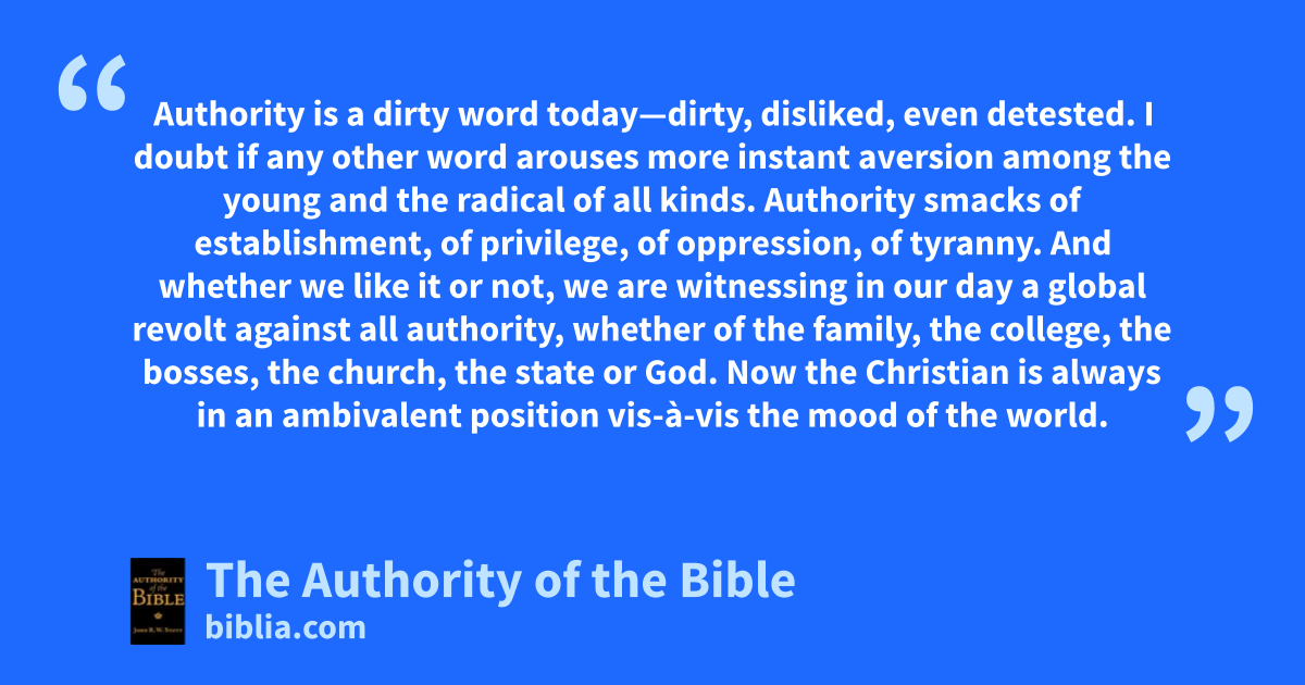 Authority is a dirty word today—dirty, disliked, even detested. I doubt if any other word arouses more instant aversion among the young and the radical of all kinds. Authority smacks of establishment, of privilege, of oppression, of tyranny. And whether we like it or not, we are witnessing in our day a global revolt against all authority, whether of the family, the college, the bosses, the church, the state or God. Now the Christian is always in an ambivalent position vis-à-vis the mood of the world.