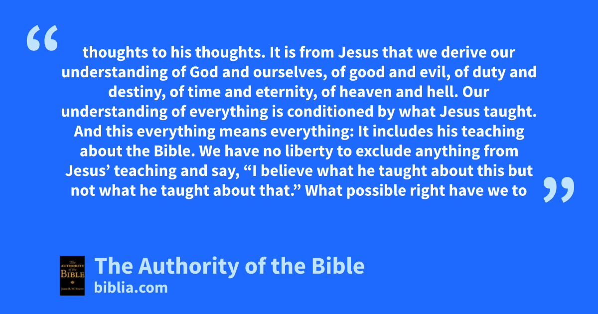 thoughts to his thoughts. It is from Jesus that we derive our understanding of God and ourselves, of good and evil, of duty and destiny, of time and eternity, of heaven and hell. Our understanding of everything is conditioned by what Jesus taught. And this everything means everything: It includes his teaching about the Bible. We have no liberty to exclude anything from Jesus’ teaching and say, “I believe what he taught about this but not what he taught about that.” What possible right have we to
