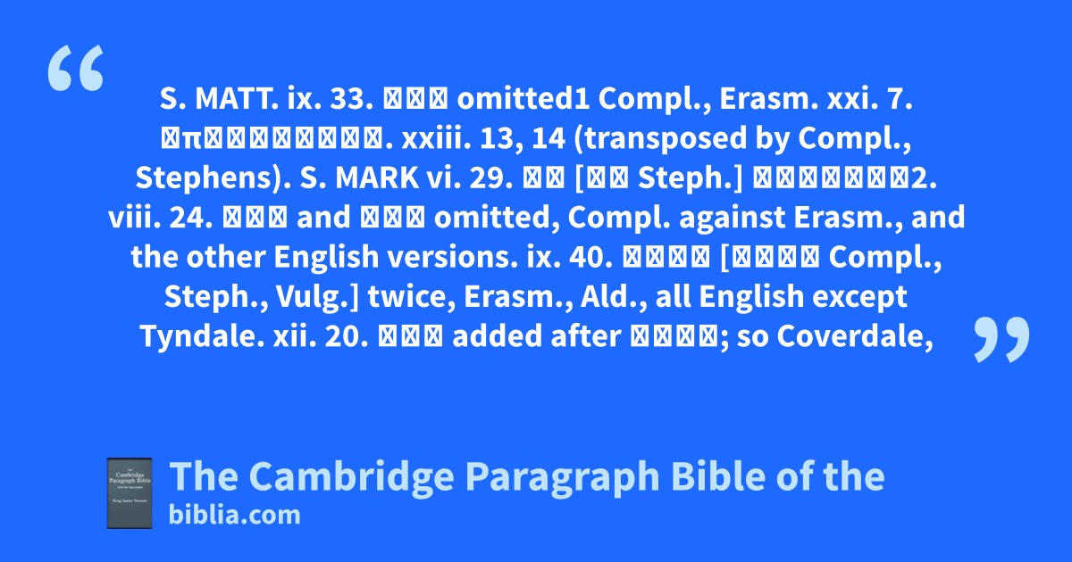 S. Matt. ix. 33. ὅτι omitted1 Compl., Erasm. xxi. 7. ἐπεκάθισαν. xxiii. 13, 14 (transposed by Compl., Stephens). S. Mark vi. 29. ἐν [τῷ Steph.] μνημείῳ2. viii. 24. ὅτι and ὁρῶ omitted, Compl. against Erasm., and the other English versions. ix. 40. ἡμῶν [ὑμῶν Compl., Steph., Vulg.] twice, Erasm., Ald., all English except Tyndale. xii. 20. οὖν added after ἦσαν; so Coverdale, Geneva 1557. S. Luke i. 35. ἐκ σοῦ added after γεννώμενον Compl., Erasm. (1516 only), Ald., Vulg. (editions), with Coverdale “(of the),” Geneva 1557. ii. 22. αὐτῆς (for αὐτῶν) Compl. vii. 12. ἱκανὸς ἦν. xv. 26. παίδων (without αὐτοῦ) Compl., Vulg., Coverdale, Geneva 1557. xvii. 35. ἡ μία Erasm., all English. ver. 36. This verse, extant in Compl., the Great Bible (within brackets and in another type), and the Bishops’, is omitted by Erasm., Vulg., and the other English versions. xxii. 45. αὐτοῦ added after μαθητάς by Erasm., Ald. S. John viii. 25. ὁ τι (ὅτι Compl., Erasm., Steph.). xiii. 30, 31. ἦν δὲ νύξ· ὅτε οὖν (ἦν δὲ νὺξ ὅτε Compl., Steph.) Erasm., Ald., Vulg., Engl.3. xvi. 33. ἕξετε, for which there is very little authority, is a false correction by Beza of a typographical error of Stephens 15504. Even Tyndale (not Coverdale), the Great Bible and Geneva 1557 have the future, after Vulg. xviii. 24. οὖν added after ἀπέστειλεν, so Geneva 1557, Bishops’ Bible: “And Annas” Tyndale, Coverdale, Great Bible, after Vulg. Acts i. 4. In Beza’s editions of 1582, 1589, 1598 (not 1565) μετʼ αὐτῶν follows συναλιζόμενος, being doubtless derived from his own celebrated manuscript, Codex D. The italics in “with them” belong to 1769: no other English have “with.” xvii. 25. καὶ τὰ πάντα Vulg. So Geneva only of preceding English versions. xxi. 8. ἤλθομεν Compl., Vulg., all English. xxii. 25. προέτειναν Compl., Beza 1589 (not 1565), Vulg., the other English; against Eras., Stephens, Coverdale προέτεινεν. xxiv. 13. παραστῆσαι (Erasm., Steph. add με) Compl. ver. 18. τινες (Erasm., Steph., Vulg., Tyndale, Coverdale, Great Bible, Bishops’ add δὲ) Compl. ver. 19. ἔδει Vulg., Geneva 1557: but δεῖ Compl., Erasm., Steph., Tyndale, Coverdale, Great Bible, Bishops’. xxvii. 13. ἆσσον Erasm. (but his Latin Asson, as Steph., Vulg., Tyndale, Coverdale, Great Bible, Bishops’): “nearer” Geneva 1557. Rom. vii. 6. ἀποθανόντος, on no known authority. viii. 11. διὰ τοῦ ἐνοικοῦντος αὐτοῦ πνεύματος Compl.: but διὰ τὸ ἐνοικοῦν αὐτοῦ πνεῦμα Eras., Ald., Steph., Vulg., all English. xii. 11. κυρίῳ Compl. (Erasm. 1516 κυρίου), Vulg., Geneva 1557, Bishops’: but καιρῷ Erasm. 1519 (and Latin of 1516), Steph., Tyndale, Coverdale, Great Bible. xvi. 20. Ἀμὴν only in Bishops’: omitted in other English, after Compl., Erasm., Steph., Vulg. 1 Cor. v. 11. ᾖ πόρνος Erasm. (Latin), Vulg., all English. ἢ πόρνος Erasm. (Greek), Steph. xiv. 10. of them is placed in the type representing italics in the Bishops’ Bible and in ours of 1611, in deference to Beza, who, after Colinæus (1534) and Vulg., would fain omit αὐτῶν. xv. 31. ὑμετέραν Compl., Vulg., Geneva 1557: but ἡμετέραν Erasm., Steph. (even Beza 1565), Tyndale, Coverdale, Great Bible, Bishops’. 2 Cor. iii. 1. ἢ μὴ χρῄζομεν Vulg., Coverdale, Bishops’, for εἰ μὴ χρ. of Compl., Erasm., Steph. v. 4. ἐφʼ ᾧ “for that” Compl., Vulg., Geneva 1557 (“wherein whiles we are”), but ἐπειδὴ Erasm., Steph., “for” Tyndale, Coverdale; “because” Great Bible, Bishops’. vi. 15. Βελίαλ Compl., Erasm. (Lat.), Vulg., all English: Βελίαρ Erasm. (Greek), Steph. vii. 12. τὴν σπουδὴν ἡμῶν τὴν ὑπὲρ ὑμῶν Compl., Vulg., Tyndale, Geneva 1557: but τὴν σπουδὴν ὑμῶν τὴν ὑπὲρ ἡμῶν Erasm., Steph., Coverdale, Great Bible, Bishops’. ver. 16. χαίρω οὖν Geneva 1557: οὖν is omitted by Compl., Erasm., Ald., Steph., Tyndale, Coverdale, Great Bible, Bishops’. xi. 10. σφραγίσεται (for φραγήσεται) is a mere error of Steph. only. Eph. i. 3. ἐν Χριστῷ Compl., Vulg., Geneva 1557, Bishops’: but Erasm., Ald., Steph. omit ἐν (“by Christ,” Tyndale, Coverdale, Great Bible). vi. 7. ὡς follows δουλεύοντες in Compl., Beza’s last three editions, Vulg., Tyndale 1526 (“even as though ye served the lorde”), but not in Erasm., Steph., Beza 1565, Tyndale 1534 or the subsequent English versions. Col. i. 2. Κολοσσαῖς in nearly all: Κολασσαῖς Erasm., Steph. ver. 24. ὃς is set before νῦν χαίρω in Beza’s last three editions, Vulg., and our Authorized Version only among the English. ii. 13. ὑμῖν Vulg., Geneva 1557 (Bishops’): but ἡμῖν Compl., Erasm., Steph., other English versions. 1 Thess. ii. 13. οὐχ ὡς λόγον ἀνθρώπων Beza 1589, 1598 (not 1565), Vulg., English (perhaps rather as an interpretation than a reading)1: the rest omit ὡς. ver. 15. ἡμᾶς all except Steph., which has ὑμᾶς. 1 Tim. i. 4. οἰκοδομίαν Erasm., Ald., Vulg., all English?, but οἰκονομίαν Compl., Steph. Titus ii. 10. ἡμῶν all except Steph., who reads ὑμῶν. Heb. ix. 1. σκηνὴ omitted by Erasm., Ald., Beza, Vulg. (“Testament” Great Bible, “covenant” Geneva 1557, Bishops’, Authorized), but Compl., Tyndale, Coverdale have it. x. 10. Compl., Erasm., Steph., but apparently no English version, prefix οἱ to διά. xii. 22, 23. Compl., Erasm., Steph., Vulg., with all the English versions before the Authorized, and most mo
