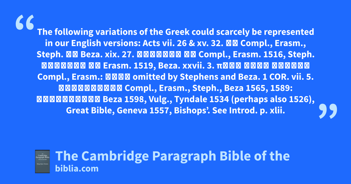 The following variations of the Greek could scarcely be represented in our English versions: Acts vii. 26 & xv. 32. τε Compl., Erasm., Steph. δὲ Beza. xix. 27. μέλλειν δὲ Compl., Erasm. 1516, Steph. μέλλειν τε Erasm. 1519, Beza. xxvii. 3. πρὸς τοὺς φίλους Compl., Erasm.: τοὺς omitted by Stephens and Beza. 1 Cor. vii. 5. συνέρχησθε Compl., Erasm., Steph., Beza 1565, 1589: συνέρχεσθε Beza 1598, Vulg., Tyndale 1534 (perhaps also 1526), Great Bible, Geneva 1557, Bishops’. See Introd. p. xlii. 2 Thess. ii. 4. “all that is called God” is the rendering of all our versions from Tyndale downwards, or it might be thought to represent Beza’s conjectural reading πᾶν τὸ for πάντα. Rev. iv. 10. Since all read πεσοῦνται, no stress can be laid on the variation between the present and future in the verbs that follow. x. 7. τελεσθῇ Compl., Erasm., Steph., Beza 1565, “shall be finished” other English versions after Vulg. But Beza’s last three editions have τελεσθήσεται, which ill suits “should be finished” of the Authorized.