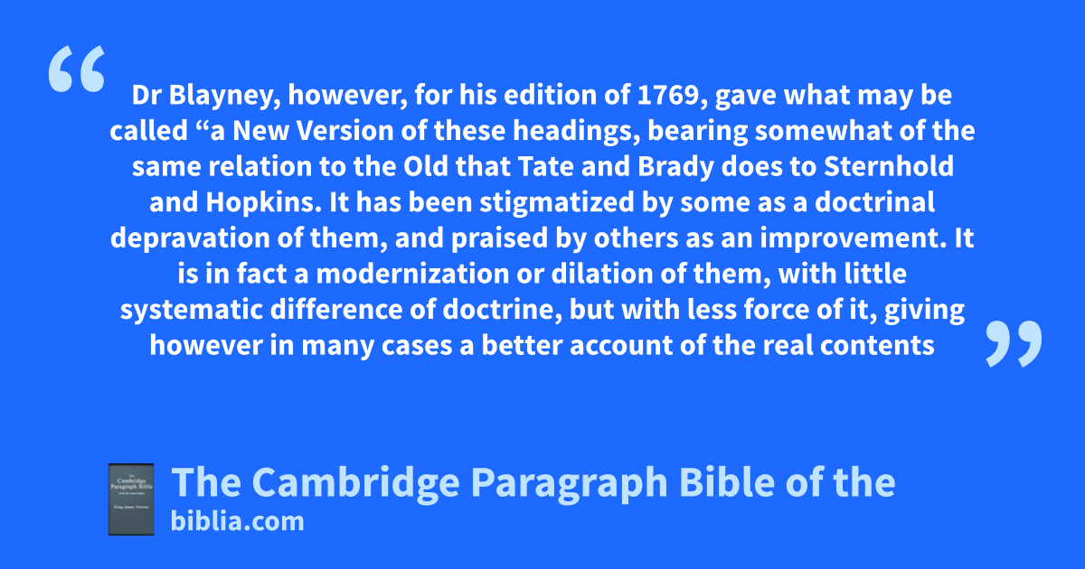The headings of the chapters, as also those set over the several columns of the text, the plan of this work compels us to dispense with altogether, and nothing considerable is lost by their omission. The column headings of necessity varied more or less for every edition which did not (like the black-letter books of 1617, 1634, and that of 1640 very nearly) correspond with the standard of 1611 page for page: the headings summing up the contents of each chapter do not much resemble those previously given either in the Genevan or in the Great and Bishops’ Bibles (which two in this particular are almost identical), but seem to be quite original. In the early chapters of the Acts of the Apostles they are inordinately long. The variations between our present headings and those of 1611, other than mere corrections of the press, are but twelve in number, that prefixed to Ps. cxlix. being the only one of importance3. Dr Blayney, however, for his edition of 1769, gave what may be called “a New Version of these headings, bearing somewhat of the same relation to the Old that Tate and Brady does to Sternhold and Hopkins. It has been stigmatized by some as a doctrinal depravation of them, and praised by others as an improvement. It is in fact a modernization or dilation of them, with little systematic difference of doctrine, but with less force of it, giving however in many cases a better account of the real contents of the chapters than the old1.” This portion of his labours Blayney speaks of with complacency in his Report to the Delegates of the Clarendon Press (Appendix D, p. xcviii.); but whatever might be its merits, it met with no sort of acceptance. Oxford Bibles have returned long since to the headings of 1611; his changes were never adopted at Cambridge. It was felt, perhaps, that there is much comment of this kind in the original edition which long prescription alone has persuaded men to tolerate, and his work was rejected not because it was bad, but because it was new.