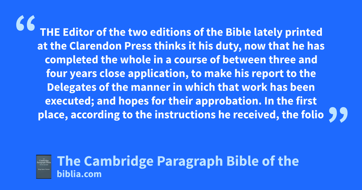 The Editor of the two editions of the Bible lately printed at the Clarendon Press thinks it his duty, now that he has completed the whole in a course of between three and four years close application, to make his report to the Delegates of the manner in which that work has been executed; and hopes for their approbation.