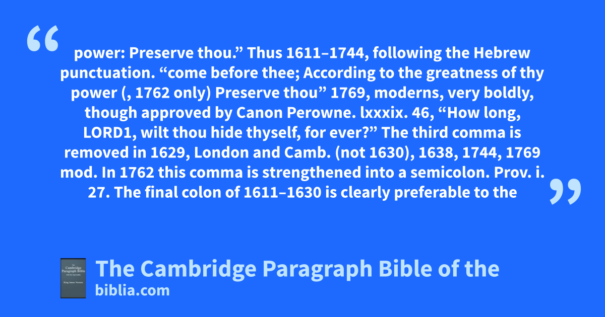 Gen. xxxi. 40, “Thus I was in the day, the drought consumed me,” 1611, after Masoretic stops, LXX., Vulg., against the Bishops’, 1638–1769, moderns, who have “Thus I was; (, 1638–1762) in the day the drought consumed me.” Lev. iv. 2, “(concerning things which ought not to be done).” Here 1769 and the moderns reject the parenthesis of the earlier books, which, though not found in vv. 13, 22, 27, tends to relieve a hard construction. Joshua iii. 16, “very far, from the city Adam,” 1611–1630. In 1629 Camb. and subsequent editions the comma after “far” is removed, but the other distribution is not less probable. 1 Kin. xii. 32, “and he || offered upon the altar (so did he in Bethel,) || sacrificing.” The moderns, after 1769, punctuate “and he || offered upon the altar. So did he in Bethel, || sacrificing:” against the Hebrew stops, Zakephkaton standing over both “altar” and “Bethel;” and rendering the margin (which provides for וַיַּעַל, being the Kal rather than the Hiphil conjugation) quite unintelligible. xix. 5, “behold then, an angel” (וְהִנֵּה־זֶה): “behold, then an angel,” 1769, moderns. Neh. ix. 4, “upon the stairs of the Levites,” (עַל־מַֽעֲלֵה֣ הַֽלְוִיִֹּם): “upon the stairs, of the Levites,” 1769, moderns. ver. 5, “Jeshua and Kadmiel,” (cf. Ezra ii. 40): “Jeshua, and Kadmiel,” 1769, moderns. Job xix. 28, “persecute we him?…found in me.” 1611–1617. But 1629 Lond., 1630 place (?) also after “me:” 1629 Camb., 1638, moderns, transfer the second clause into the oratio obliqua “persecute we him,…found in me?” xxxi. 30. This verse is rightly set in a parenthesis in 1611–1744, which 1762, moderns, remove. xxxiii. 5, “If thou canst, answer me,” as in ver. 32. The first comma is removed in 1629 Camb. (not 1629 Lond., 1630) and all modern books. xl. 24 marg. “or bore,” 1611: “or bore,” 1629, 1638, Bagster 1846. But 1744, 1762, moderns, “or, bore,” quite absurdly. Psalm ii. 12, “but a little: Blessed,” 1611–1744, “but a little. Blessed,” 1762 mod.5 lxxix. 5, “wilt thou be angry, for ever?” Cf. Ps. xiii. 1; lxxxix. 46. The comma is removed by 1616 (not 1617, 1630), 1629 Camb., &c. ver. 11, “come before thee, According to the greatness of thy power: Preserve thou.” Thus 1611–1744, following the Hebrew punctuation. “come before thee; According to the greatness of thy power (, 1762 only) Preserve thou” 1769, moderns, very boldly, though approved by Canon Perowne. lxxxix. 46, “How long, Lord1, wilt thou hide thyself, for ever?” The third comma is removed in 1629, London and Camb. (not 1630), 1638, 1744, 1769 mod. In 1762 this comma is strengthened into a semicolon. Prov. i. 27. The final colon of 1611–1630 is clearly preferable to the full stop of 1629 Camb., moderns. xix. 2. Restore the comma before “sinneth” discarded in 1762: also in xxi. 28, that before “speaketh,” removed in 1769: both these for the sake of perspicuity. xxx. 1 fin. The full stop is changed into a comma by 1769 mod. Eccles. ii. 3, “(yet acquainting mine heart with wisdom).” In 1769 mod. the marks of parenthesis are rejected, and a semicolon placed after “wisdom.” Cant. vii. 9, “, For my beloved, that” 1611, &c. (“, For my beloved that,” 1629 Lond., 1630: almost preferable; cf. Heb.): “For my beloved, that” 1769, moderns. viii. 2, “, of the juice” 1611–1630: “of the juice” 1629 Camb., 1638, &c. Isai. xxiv. 14, “they shall sing,”. The comma is found only in 1611 (Oxford reprint, not Synd. A. 3. 14), and acknowledged by Vulg. and Field (“jubilabunt;”) as representing the Hebrew Athnakh. xlviii. 12, “,O Jacob, and Israel my called;” 1611–1630. But 1629 Camb. 1638 place commas after “Israel,” 1769 and the moderns join “Jacob and Israel,” against the Hebrew stops. Lam. ii. 4, “pleasant to the eye,” (cf. Heb. stop): 1769 mod. remove the comma. iv. 15, “, when they fled away and wandered:” (, for : in 1769 mod.). Hosea vii. 11, “a silly dove, without heart.” In 1629 Camb. and the moderns, the comma (which represents the Hebrew accent) is removed, as if “without heart” referred exclusively to the dove. Hagg. i. 1, 12, 14; ii. 2, remove comma of 1769 mod. after “Josedech.” Cf. Zech. i. 1.