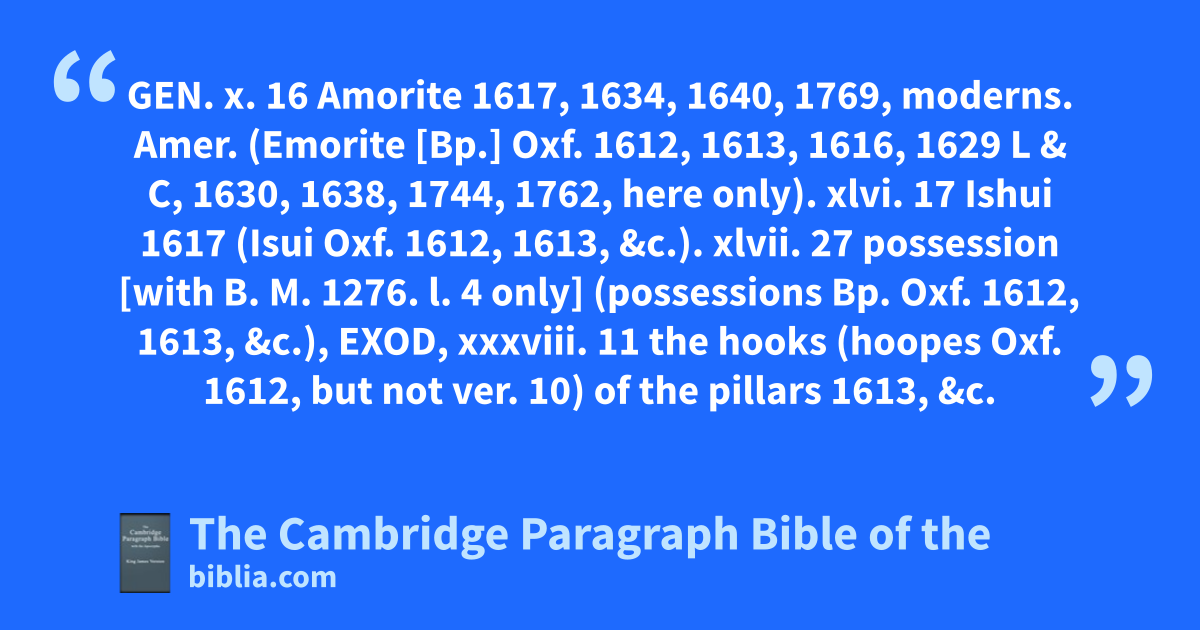 Gen. x. 16 Amorite 1617, 1634, 1640, 1769, moderns. Amer. (Emorite [Bp.] Oxf. 1612, 1613, 1616, 1629 L & C, 1630, 1638, 1744, 1762, here only). xlvi. 17 Ishui 1617 (Isui Oxf. 1612, 1613, &c.). xlvii. 27 possession [with B. M. 1276. l. 4 only] (possessions Bp. Oxf. 1612, 1613, &c.), Exod, xxxviii. 11 the hooks (hoopes Oxf. 1612, but not ver. 10) of the pillars 1613, &c. cf. Bp. ver. 10, 114. Lev. xviii. 30 ye shall 1630 (shall ye Bp. Oxf. 1612, 1613, 1629 L & C, &c.). Num. x. 2 thou shalt (shalt thou Bp. Oxf. 1612, 1613, &c.). xxvi. 21 Hezronites [with B. M. 1276. l. 4 only] (Hesronites Bp. Oxf. 1612, 1613, &c). Deut. viii. 7 the valleys (valleys Bp. Oxf. 1612, 1613, &c.). xvii. 4 it is true1 (it be true Bp. Oxf. 1612, 1613, &c). xxxii. 15 Thou art waxed 1617 (Thou art waxen Oxf. 1612, 1613, &c.). 2 Sam. xvii. 25 Abigal2 1612, 1613, 1616, 1617 (Abigail Bp. Oxf. 1629 C & L, &c., as in 1 Chr. ii. 16). 1 Kin. iii. 20 rose [with B. M. 1276. l. 4 only] 1613 (arose Bp. Oxf. 1612, 1616, 1617, &c.). ix. 22 bondman 1613 (bondmen Bp. Oxf., B. M. 3050. g. 3, 1612, 1616, 1617, &c.). Job xix. 15 maidens Bp. 1613 (maides Oxf. 1612, 1616, &c.). Prov. xi. 20 unto the Lord 1613 (to the Lord Oxf., B. M. 3050. g. 3, 1612, 1616, 1617, &c.). Cant. ii. 7 till he please (so all known editions except Oxf.3 till she please here only, not ch. iii. 5; viii. 4). Isai. xlix. 1 from afar 1613, 1617 (from far Oxf. 1612, 1616, 1629 C & L, &c.). ver. 20 strait 1613, 1617 (straight Oxf. 1612, 1616). lix. 21 thy seed 1612, 1613, 1616, 1617 (the seed Oxf.). lxv. 2 mine hands 1617 (my hands Oxf. 1612, 1613, 1616). Cf. ch. lxiv. 8. Jer. v. 24 latter 1612, 1613, 1617 (later Oxf. 1616, not in ch. iii. 3). xxv. 15 mine hand 1613 (my hand Bp. Oxf. 1612, 1616, 1617, 1629, &c.). Ezek. vi. 14 mine hand [with 3050. g. 3 only] Bp. 1613 (my hand Oxf. 1612, 1616, 1617, 1629, &c.). xx. 37 marg. delivering 1613, 1630 (a deliring Oxf.: so 1612, 1616, 1617, 1629 C & L, &c.). xxxi. 18 with the sword Bp. 1617 (by the sword Oxf. 1612, 1613, 1616). Cf. ver. 17; ch. xxxii. 28, or ch. xxxii. 20, 21, 25, 26, 29, 30. xxxix. 9 marg. for them4, 1617 (of them Oxf. 1612, 1613, 1616, &c.). Dan. ii. 14 marg. Chal. (Cald. Oxf. 1612–1630). ver. 34 in pieces 1617, 1630 (to pieces Bp. Oxf. 1612, 1613, 1616, &c.); cf. ver. 40 bis, 44, 45, or ver. 35. Hos. vi. 5 hewed 1612, 1613, 1617, &c. (shewed Oxf. 1616). Nah. i. 10 while they be drunken 1617 (while they are drunken Oxf. 1612, 1613, 1616, &c.).