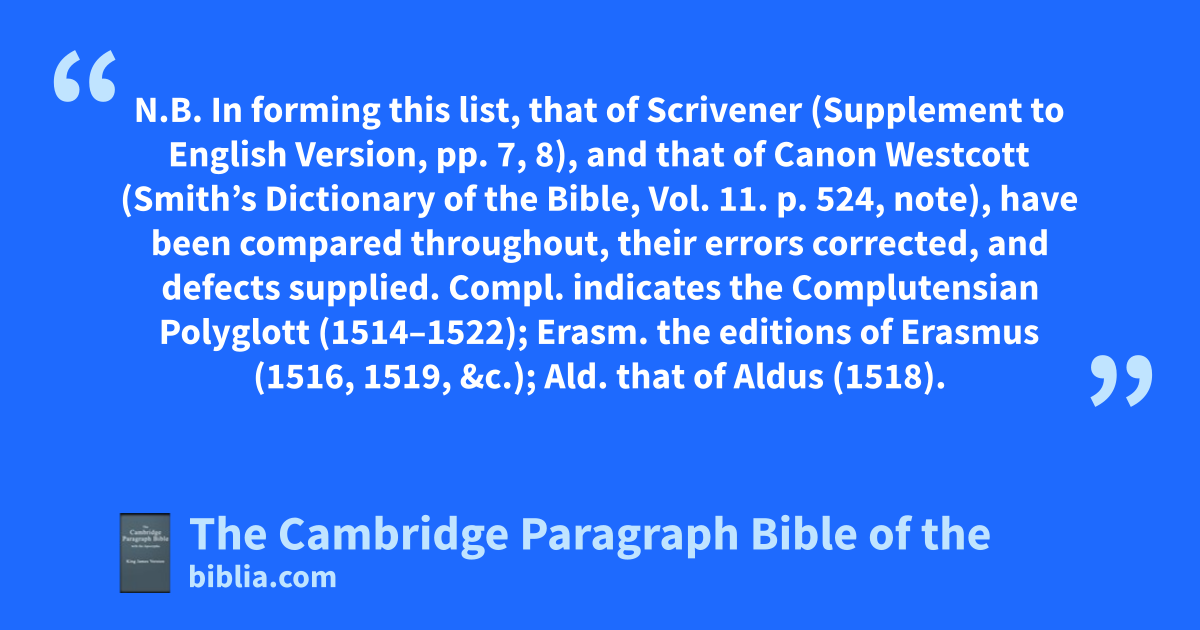 N.B. In forming this list, that of Scrivener (Supplement to English Version, pp. 7, 8), and that of Canon Westcott (Smith’s Dictionary of the Bible, Vol. 11. p. 524, note), have been compared throughout, their errors corrected, and defects supplied. Compl. indicates the Complutensian Polyglott (1514–1522); Erasm. the editions of Erasmus (1516, 1519, &c.); Ald. that of Aldus (1518).