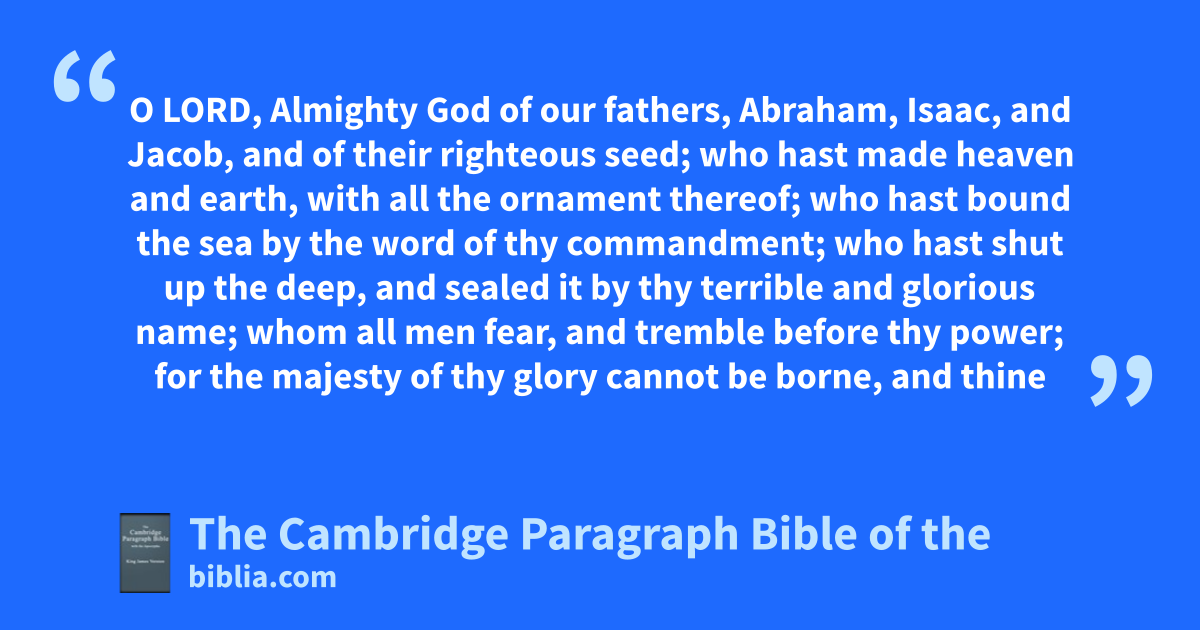 * O Lord, aAlmighty God of our fathers, Abraham, Isaac, and Jacob, and of their grighteous seed; 2 bwho hast made heaven and earth, with all the ornament thereof; 3 bwho hast bound the sea by the word of thy commandment; who hast shut up the deep, and sealed it by thy terrible and glorious name; 4 whom all men fear, and tremble before thy power; 5 for the majesty of thy glory cannot be borne, and thine angry threatening towards sinners is importable; 6 but thy merciful promise is unmeasurable and cunsearchable; 7 for thou art the most high Lord, of degreat compassion, longsuffering, very merciful, eand repentest of the evils of men: Thou, O Lord, according to thy great goodness hast promised repentance and forgiveness to them that have sinned against thee: and of thine infinite mercies hast appointed frepentance unto sinners, fthat they may be saved.