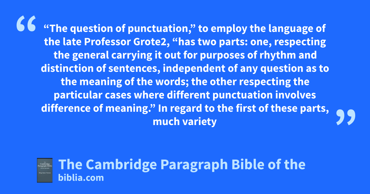 “The question of punctuation,” to employ the language of the late Professor Grote2, “has two parts: one, respecting the general carrying it out for purposes of rhythm and distinction of sentences, independent of any question as to the meaning of the words; the other respecting the particular cases where different punctuation involves difference of meaning.” In regard to the first of these parts, much variety of practice will always exist, according to the age in which a writer lives, or the fashion which he has adopted for himself. Thus the edition of 1611 abounds with parentheses1 which are largely discarded in modern Bibles, wherein commas supply their place, unless indeed they are left unrepresented altogether. The note of admiration, which is seldom met with in the old black-letter copies (wherein the note of interrogation usually stands in its room: e.g. Prov. xix. 7) is scattered more thickly over Blayney’s pages than the taste of the present times would approve. Upon the whole, while the system of recent punctuation is heavier and more elaborate than necessity requires, and might be lightened to advantage, as in this volume has been attempted2; that of the standard of 1611 is too scanty to afford the guidance needed by the voice and eye in the act of public reading. “It is a torture to read aloud from, as those who have had to do it know3.” Grote contrasts it in this particular with a Cambridge edition of 1683, into which more changes in the stops were admitted than later books cared to follow, and whose punctuation differs in fact but little from that in vogue in recent times.