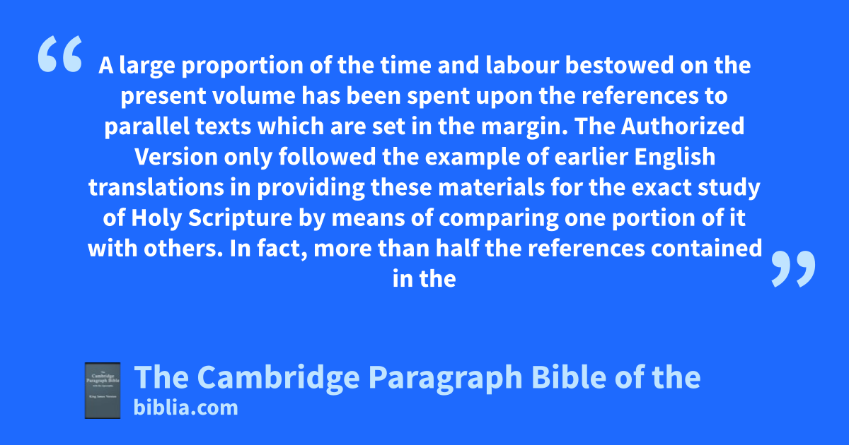 A large proportion of the time and labour bestowed on the present volume has been spent upon the references to parallel texts which are set in the margin. The Authorized Version only followed the example of earlier English translations in providing these materials for the exact study of Holy Scripture by means of comparing one portion of it with others. In fact, more than half the references contained in the edition of 1611 are derived from manuscript and printed copies of the Vulgate Latin Bible, and thus present to us the fruits of the researches of mediæval scholars and the traditional expositions of the Western Church. The references found in the standard of 1611, however, scarcely amount to a seventh part of those printed in modern Bibles, and have been computed not to exceed nine thousand6; the whole of which, inasmuch as they must be regarded as an integral portion of the Translators’ work, have been scrupulously retained in this volume; except only a few where the reference is hopelessly wrong. Such are Chap. xvi. 15 in the margin of 2 Sam. xix. 19: Eccles. v. 12 in that of Job xx. 19: Judg. xiii. 21 in that of Ps. cvi. 2: Judg. vii. 19 in that of Ps. cvi. 6. Sometimes they appear to have mistaken the drift or meaning of the passage; e.g. 1 Chron. ix. set over against Neh. xii. 23, where our existing books of the Chronicles are scarcely meant at all: Prov. xv. 30 as parallel to Eccles. vii. 1: Ps. cxxxii. 6 as parallel to Jer. vii. 14: and 2 Macc. iii. 4 referred to in Ecclus. l. 1, although quite a different person is meant: the last two have disappeared from modern Bibles. Occasionally, indeed, the original reference has been preserved by us, where it would hardly have been accepted on its own merits: such is the case of Ex. xxxiv. 6 in the margin of Neh. ix. 32: Deut. vii. 1, (2) in that of Ps. cxlix. 9: Ps. l. 9 in that of Prov. xxi. 27: Isai. liii. 3 in that of Wisd. ii. 15: 2 Cor. iii. 17 in that of John iv. 24: Matt. xxviii. 19 in that of John xv. 16: Mark ix. 12 (from the Vulgate) in Isai. liii. 3: Rom. vii. 9 in 1 Thess. iii. 87. The doubtful appropriateness of these references is occasionally indicated by annexing to them the note of interrogation (?). As we cannot praise very highly the typographical correctness of the Bibles of 1611 in other particulars (see p. xii.), so it must be stated that no other portion of the work is so carelessly printed as these parallel texts, each issue having a few errors peculiar to itself1, but few leaves indeed being exempt from some gross fault common to them both. The references to the Psalms direct us constantly to the wrong verse; namely, that of the Latin Vulgate from which they were first derived, not to that of the English Bible on whose pages they stand. The marks of reference from the text to the margin are so often misplaced, that it would be endless to enumerate glaring errors in regard to them which have long since been removed.