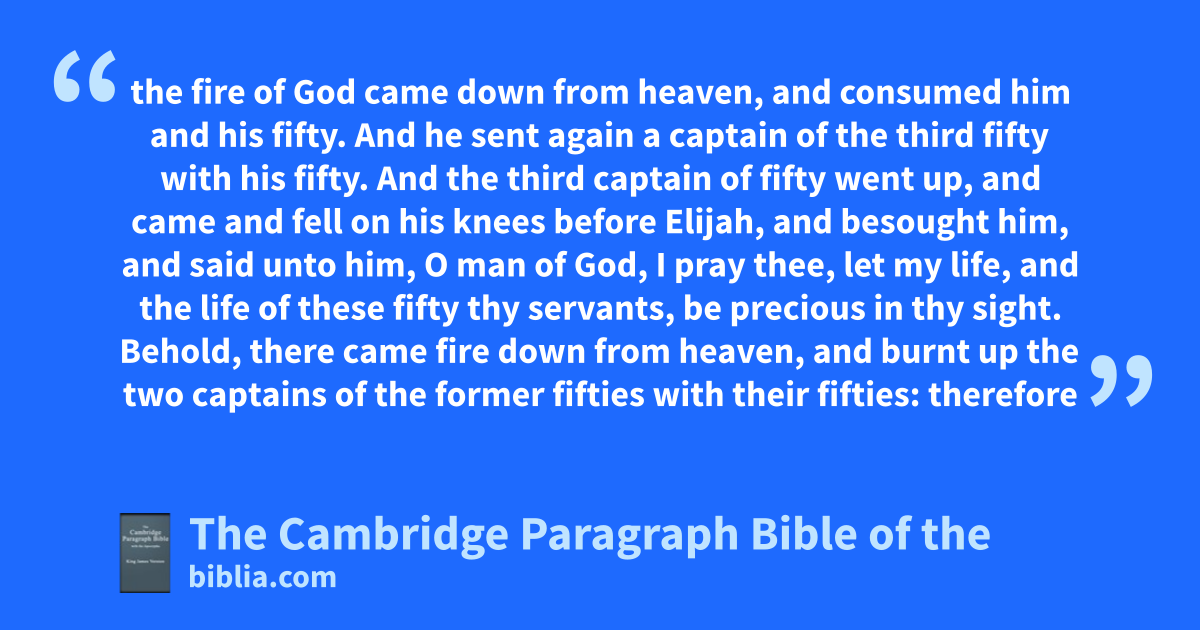 I. * Then Moab arebelled against Israel bafter the death of Ahab. 2 And Ahaziah fell down through a lattice in his cupper chamber that was in Samaria, and was sick: and he sent messengers, and said unto them, Go, inquire of dBaal-zebub the god of eEkron whether fI shall recover of this disease. 3 But the angel of the Lord said to Elijah gthe Tishbite, Arise, go up to meet the messengers of the king of Samaria, and say unto them, Is it not because there is not a God in Israel, that ye go to inquire of dBaal-zebub the god of eEkron? 4 Now therefore thus saith the Lord, * Thou shalt not come down from that bed on which thou art gone up, but shalt surely die. And Elijah departed. 5 And when the messengers turned back unto him, he said unto them, Why are ye now turned back? 6 And they said unto him, There came a man up to meet us, and said unto us, Go, turn again unto the king that sent you, and say unto him, Thus saith the Lord, Is it not because there is not a God in Israel, that thou sendest to inquire of dBaal-zebub the god of eEkron? therefore thou shalt not come down from that bed on which thou art gone up, but shalt surely die. 7 And he said unto them, * What manner of man was he which came up to meet you, and told you these words? 8 And they answered him, He was ha hairy man, and girt with a girdle of leather about his loins. And he said, It is Elijah gthe Tishbite. 9 Then the king sent unto him a captain of fifty with his fifty. And he went up to him: and behold, he sat on the top of a hill. And he spake unto him, Thou iman of God, the king hath said, Come down. 10 And Elijah answered and said to the captain of fifty, If I be a man of God, then jlet fire come down from heaven, and consume thee and thy fifty. And there came down fire from heaven, and consumed him and his fifty. 11 Again also he sent unto him another captain of fifty with his fifty. And he answered and said unto him, O man of God, thus hath the king said, Come down quickly. 12 And Elijah answered and said unto them, If I be a man of God, let fire come down from heaven, and consume thee and thy fifty. And kthe fire of God came down from heaven, and consumed him and his fifty. 13 And he sent again a captain of the third fifty with his fifty. And the third captain of fifty went up, and came and * fell on his knees before Elijah, and besought him, and said unto him, O man of God, I pray thee, let my life, and the life of these fifty thy servants, lbe precious in thy sight. 14 Behold, there came fire down from heaven, and burnt up the two captains of the former fifties with their fifties: therefore let my life now be precious in thy sight. 15 And the angel of the Lord said unto Elijah, Go down with him: be not afraid of him. And he arose, and went down with him unto the king. 16 And he said unto him, Thus saith the Lord, Forasmuch as thou hast sent messengers to inquire of dBaal-zebub the god of eEkron, is it not because there is no God in Israel to inquire of his word? therefore thou shalt not come down off that bed on which thou art gone up, but shalt surely die. 17 * So he died according to the word of the Lord which Elijah had spoken. And * Jehoram reigned in his stead in the second year of Jehoram the son of Jehoshaphat king of Judah; because he had no son. 18 Now the rest of the acts of Ahaziah which he did, are they not written in the book of the chronicles of the kings of Israel?
