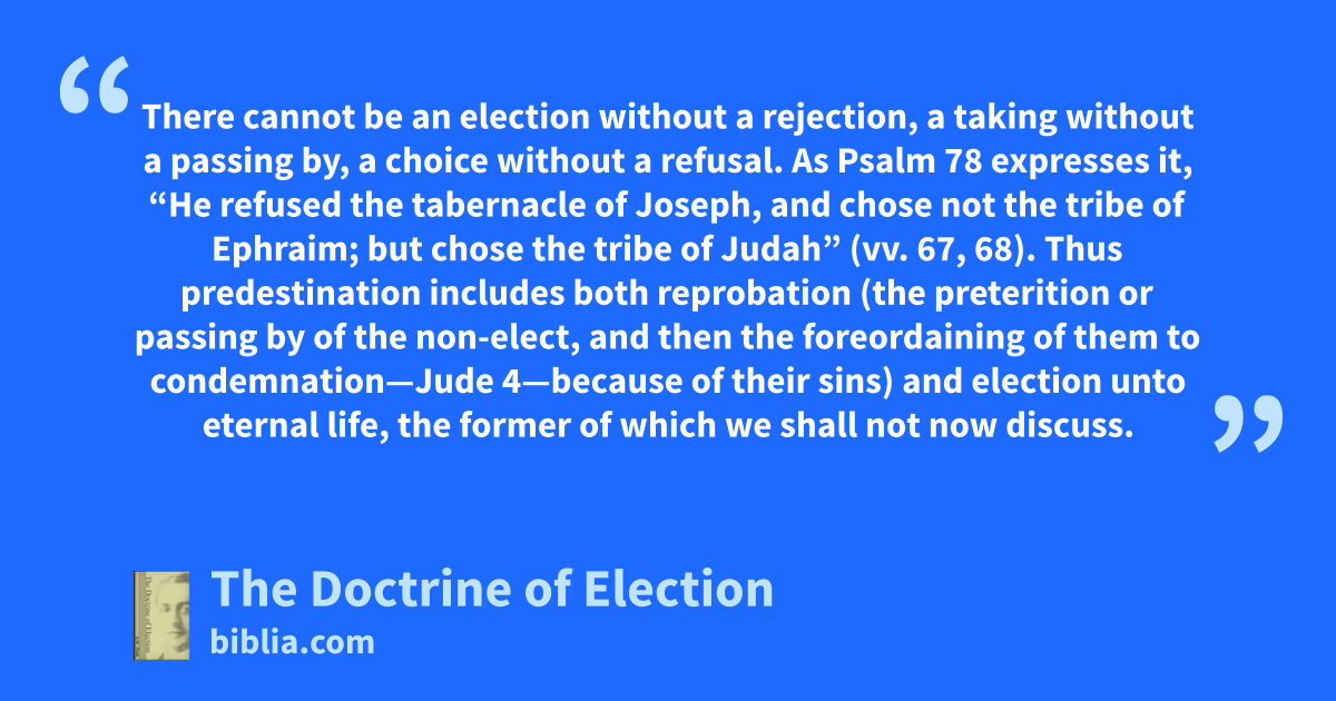 There cannot be an election without a rejection, a taking without a passing by, a choice without a refusal. As Psalm 78 expresses it, “He refused the tabernacle of Joseph, and chose not the tribe of Ephraim; but chose the tribe of Judah” (vv. 67, 68). Thus predestination includes both reprobation (the preterition or passing by of the non-elect, and then the foreordaining of them to condemnation—Jude 4—because of their sins) and election unto eternal life, the former of which we shall not now discuss.