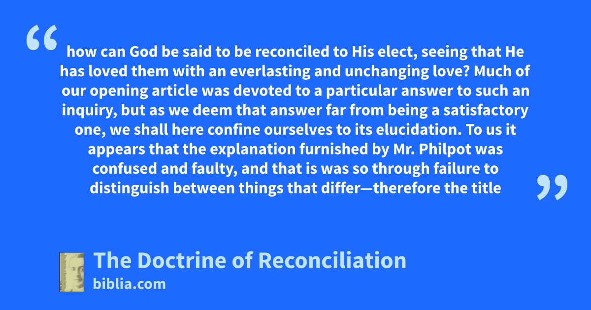 how can God be said to be reconciled to His elect, seeing that He has loved them with an everlasting and unchanging love? Much of our opening article was devoted to a particular answer to such an inquiry, but as we deem that answer far from being a satisfactory one, we shall here confine ourselves to its elucidation. To us it appears that the explanation furnished by Mr. Philpot was confused and faulty, and that is was so through failure to distinguish between things that differ—therefore the title