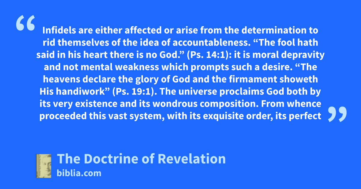 Infidels are either affected or arise from the determination to rid themselves of the idea of accountableness. “The fool hath said in his heart there is no God.” (Ps. 14:1): it is moral depravity and not mental weakness which prompts such a desire. “The heavens declare the glory of God and the firmament showeth His handiwork” (Ps. 19:1). The universe proclaims God both by its very existence and its wondrous composition. From whence proceeded this vast system, with its exquisite order, its perfect
