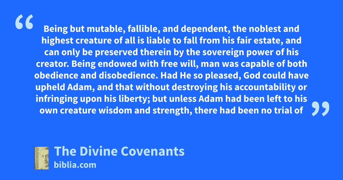 Being but mutable, fallible, and dependent, the noblest and highest creature of all is liable to fall from his fair estate, and can only be preserved therein by the sovereign power of his creator. Being endowed with free will, man was capable of both obedience and disobedience. Had He so pleased, God could have upheld Adam, and that without destroying his accountability or infringing upon his liberty; but unless Adam had been left to his own creature wisdom and strength, there had been no trial of
