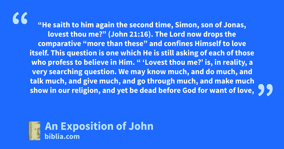 “He saith to him again the second time, Simon, son of Jonas, lovest thou me?” (John 21:16). The Lord now drops the comparative “more than these” and confines Himself to love itself. This question is one which He is still asking of each of those who profess to believe in Him. “ ‘Lovest thou me?’ is, in reality, a very searching question. We may know much, and do much, and talk much, and give much, and go through much, and make much show in our religion, and yet be dead before God for want of love,