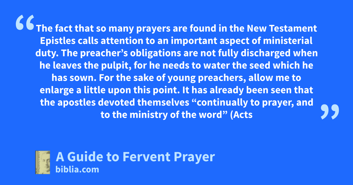The fact that so many prayers are found in the New Testament Epistles calls attention to an important aspect of ministerial duty. The preacher’s obligations are not fully discharged when he leaves the pulpit, for he needs to water the seed which he has sown. For the sake of young preachers, allow me to enlarge a little upon this point. It has already been seen that the apostles devoted themselves “continually to prayer, and to the ministry of the word” (Acts