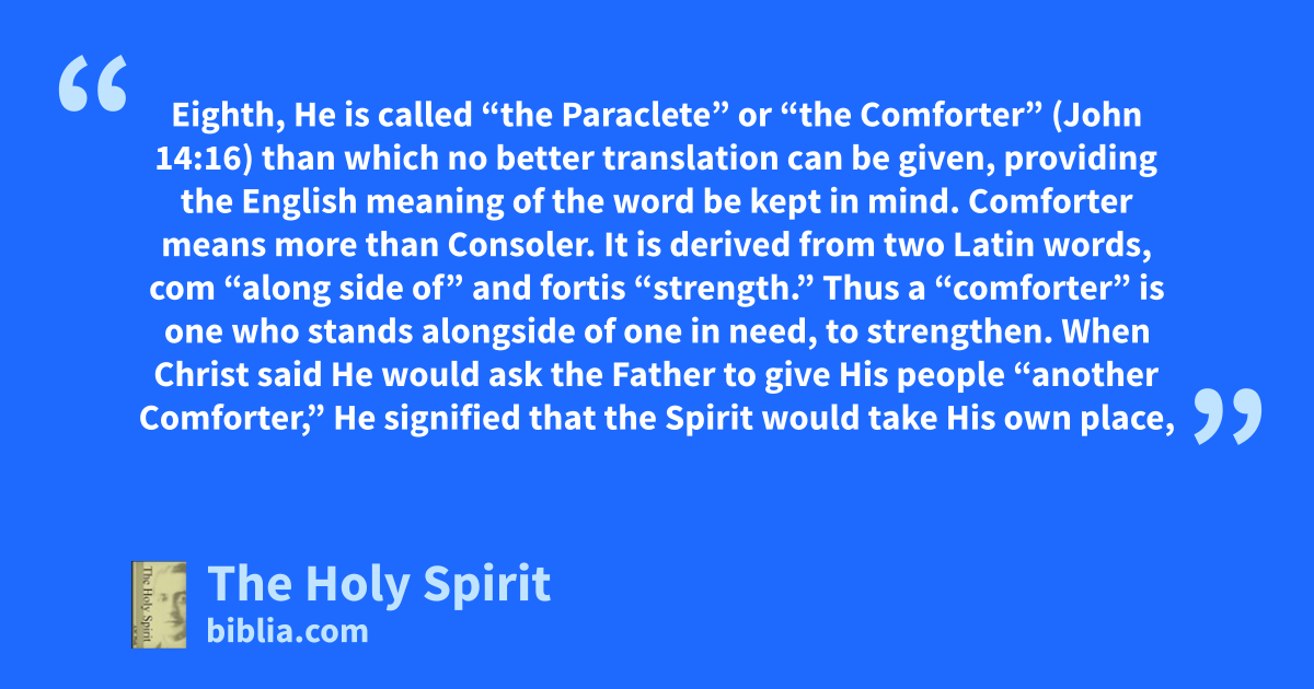 Eighth, He is called “the Paraclete” or “the Comforter” (John 14:16) than which no better translation can be given, providing the English meaning of the word be kept in mind. Comforter means more than Consoler. It is derived from two Latin words, com “along side of” and fortis “strength.” Thus a “comforter” is one who stands alongside of one in need, to strengthen. When Christ said He would ask the Father to give His people “another Comforter,” He signified that the Spirit would take His own place,