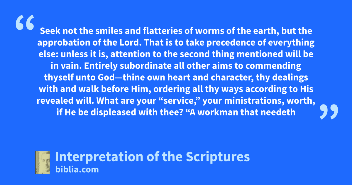 Seek not the smiles and flatteries of worms of the earth, but the approbation of the Lord. That is to take precedence of everything else: unless it is, attention to the second thing mentioned will be in vain. Entirely subordinate all other aims to commending thyself unto God—thine own heart and character, thy dealings with and walk before Him, ordering all thy ways according to His revealed will. What are your “service,” your ministrations, worth, if He be displeased with thee? “A workman that needeth