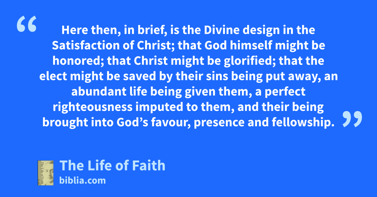 Here then, in brief, is the Divine design in the Satisfaction of Christ; that God himself might be honored; that Christ might be glorified; that the elect might be saved by their sins being put away, an abundant life being given them, a perfect righteousness imputed to them, and their being brought into God’s favour, presence and fellowship.