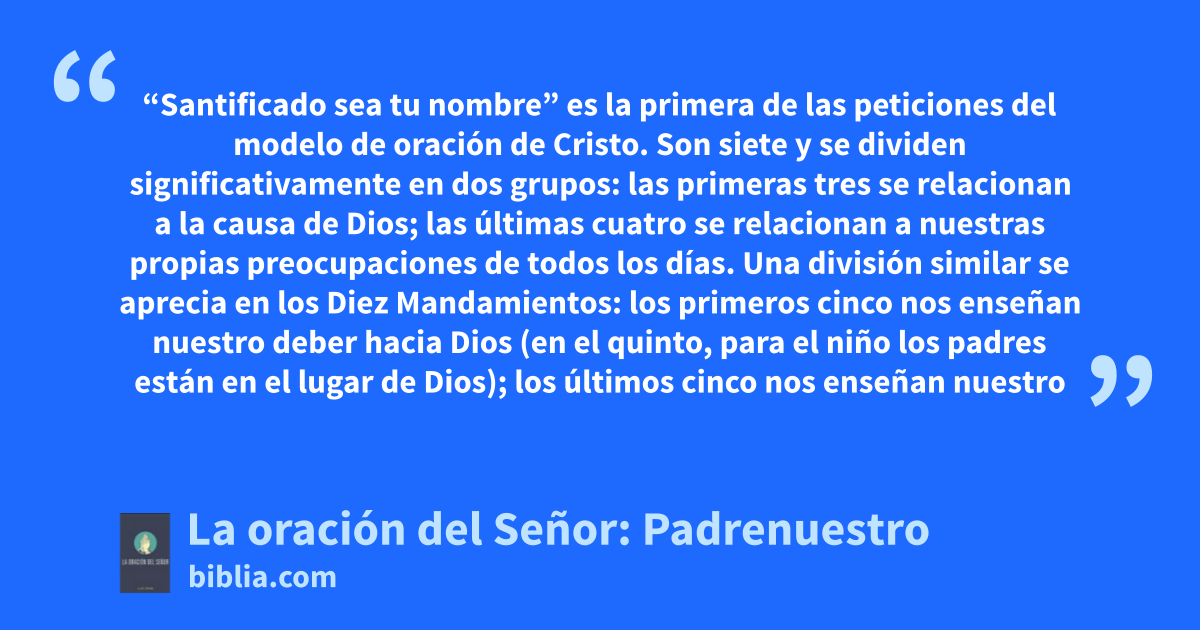 “Santificado sea tu nombre” es la primera de las peticiones del modelo de oración de Cristo. Son siete y se dividen significativamente en dos grupos: las primeras tres se relacionan a la causa de Dios; las últimas cuatro se relacionan a nuestras propias preocupaciones de todos los días. Una división similar se aprecia en los Diez Mandamientos: los primeros cinco nos enseñan nuestro deber hacia Dios (en el quinto, para el niño los padres están en el lugar de Dios); los últimos cinco nos enseñan nuestro