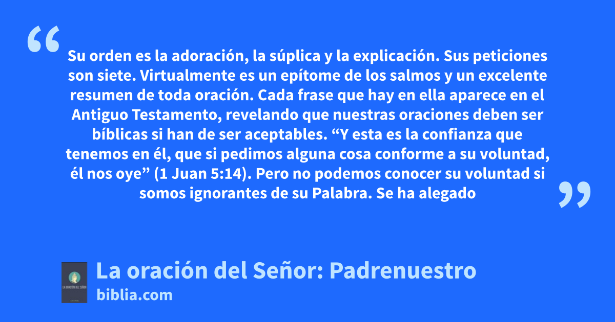 Su orden es la adoración, la súplica y la explicación. Sus peticiones son siete. Virtualmente es un epítome de los salmos y un excelente resumen de toda oración. Cada frase que hay en ella aparece en el Antiguo Testamento, revelando que nuestras oraciones deben ser bíblicas si han de ser aceptables. “Y esta es la confianza que tenemos en él, que si pedimos alguna cosa conforme a su voluntad, él nos oye” (1 Juan 5:14). Pero no podemos conocer su voluntad si somos ignorantes de su Palabra. Se ha alegado
