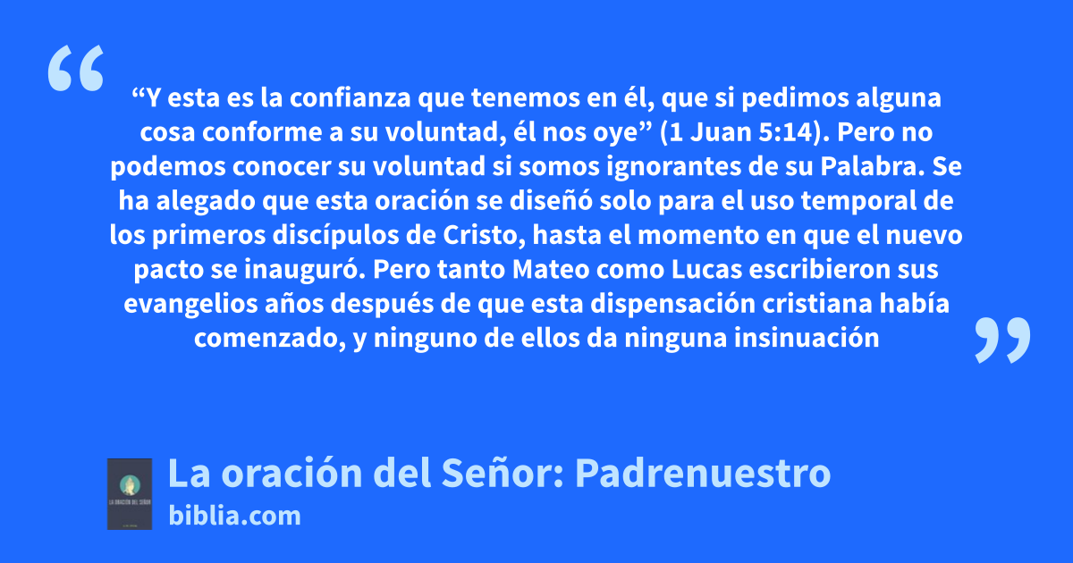 “Y esta es la confianza que tenemos en él, que si pedimos alguna cosa conforme a su voluntad, él nos oye” (1 Juan 5:14). Pero no podemos conocer su voluntad si somos ignorantes de su Palabra. Se ha alegado que esta oración se diseñó solo para el uso temporal de los primeros discípulos de Cristo, hasta el momento en que el nuevo pacto se inauguró. Pero tanto Mateo como Lucas escribieron sus evangelios años después de que esta dispensación cristiana había comenzado, y ninguno de ellos da ninguna insinuación
