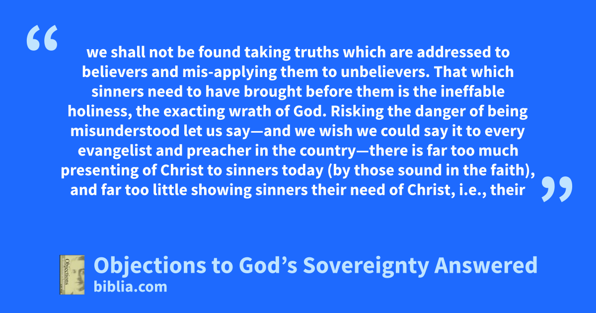 we shall not be found taking truths which are addressed to believers and mis-applying them to unbelievers. That which sinners need to have brought before them is the ineffable holiness, the exacting wrath of God. Risking the danger of being misunderstood let us say—and we wish we could say it to every evangelist and preacher in the country—there is far too much presenting of Christ to sinners today (by those sound in the faith), and far too little showing sinners their need of Christ, i.e., their