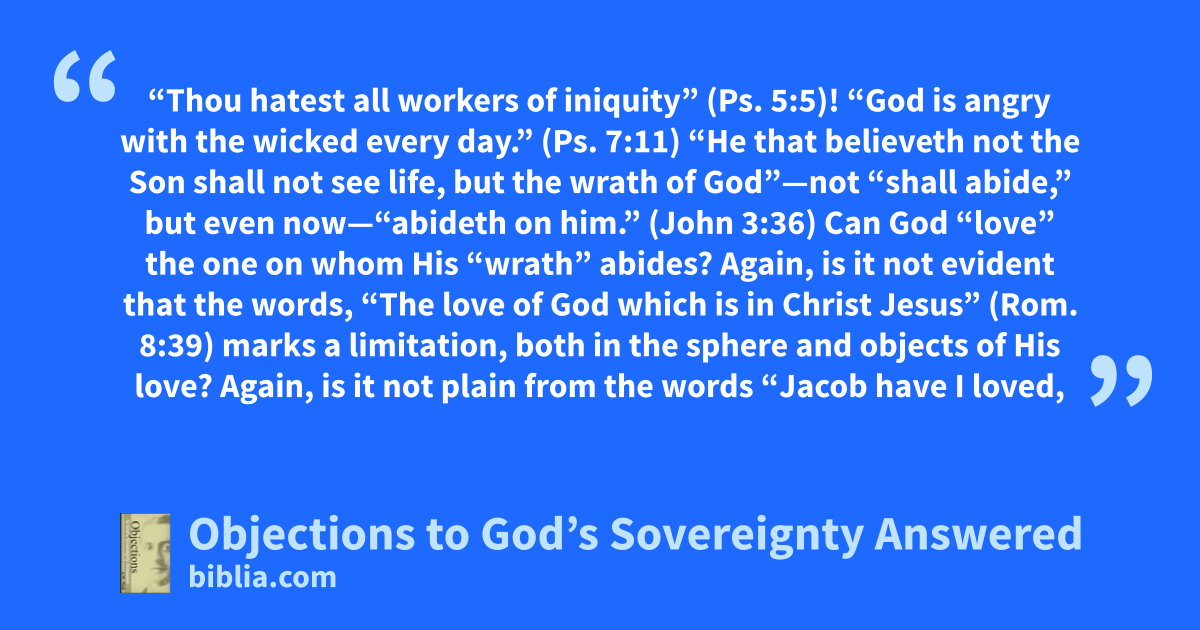 “Thou hatest all workers of iniquity” (Ps. 5:5)! “God is angry with the wicked every day.” (Ps. 7:11) “He that believeth not the Son shall not see life, but the wrath of God”—not “shall abide,” but even now—“abideth on him.” (John 3:36) Can God “love” the one on whom His “wrath” abides? Again, is it not evident that the words, “The love of God which is in Christ Jesus” (Rom. 8:39) marks a limitation, both in the sphere and objects of His love? Again, is it not plain from the words “Jacob have I loved,
