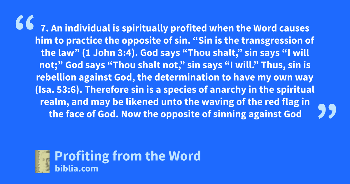 7. An individual is spiritually profited when the Word causes him to practice the opposite of sin. “Sin is the transgression of the law” (1 John 3:4). God says “Thou shalt,” sin says “I will not;” God says “Thou shalt not,” sin says “I will.” Thus, sin is rebellion against God, the determination to have my own way (Isa. 53:6). Therefore sin is a species of anarchy in the spiritual realm, and may be likened unto the waving of the red flag in the face of God. Now the opposite of sinning against God