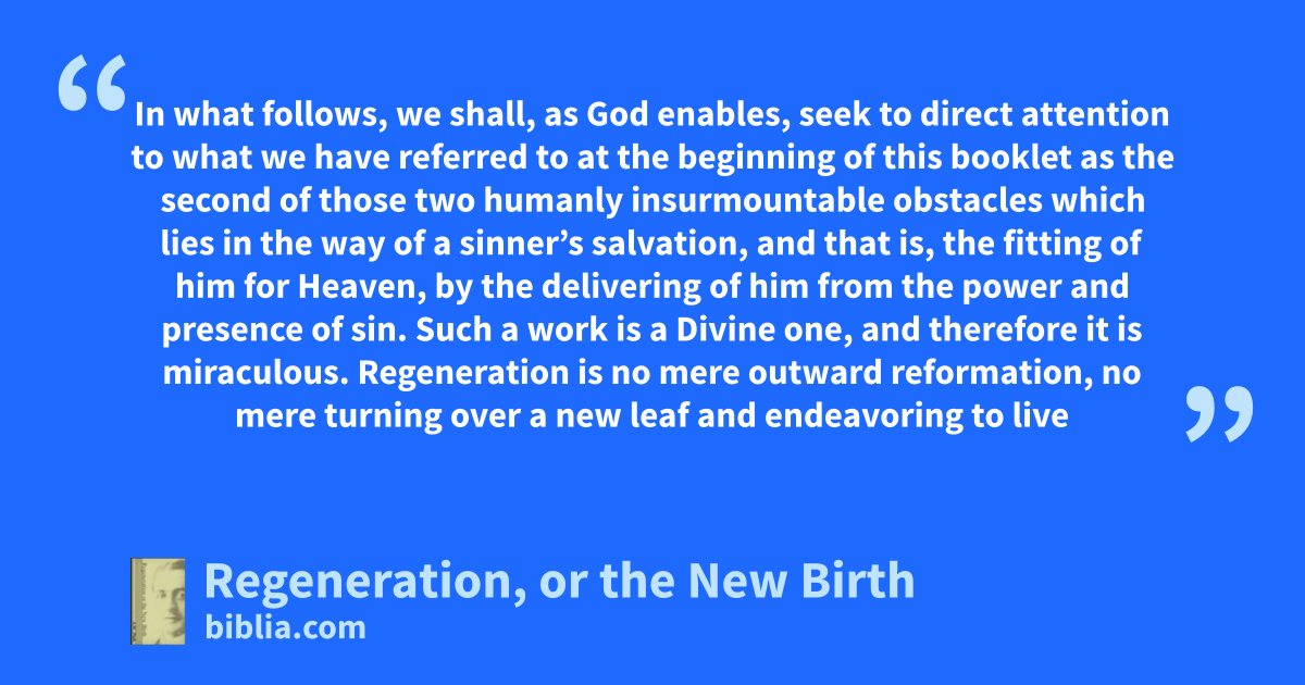 In what follows, we shall, as God enables, seek to direct attention to what we have referred to at the beginning of this booklet as the second of those two humanly insurmountable obstacles which lies in the way of a sinner’s salvation, and that is, the fitting of him for Heaven, by the delivering of him from the power and presence of sin. Such a work is a Divine one, and therefore it is miraculous. Regeneration is no mere outward reformation, no mere turning over a new leaf and endeavoring to live