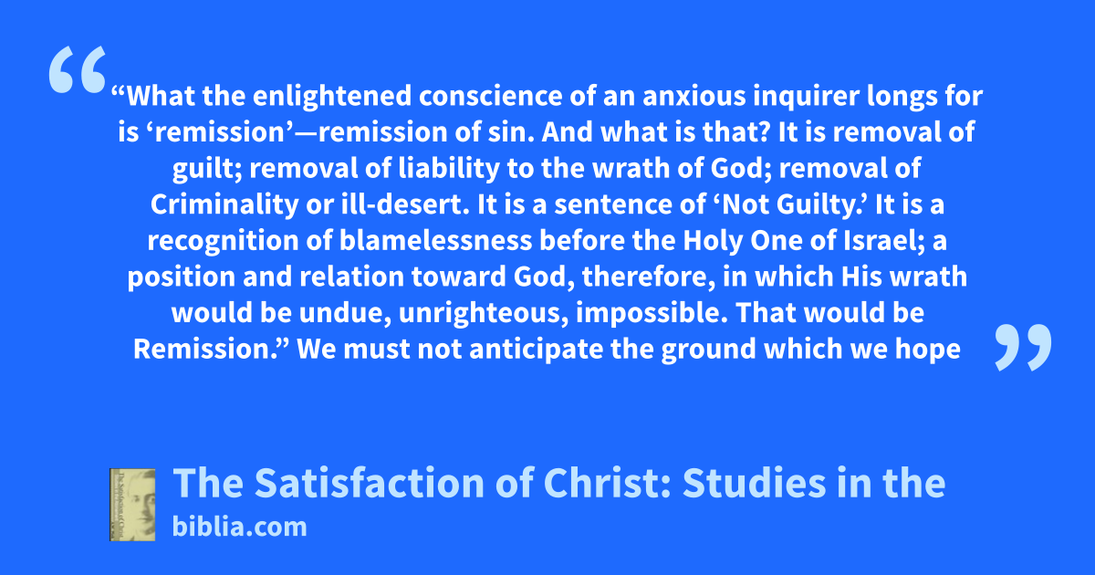 “What the enlightened conscience of an anxious inquirer longs for is ‘remission’—remission of sin. And what is that? It is removal of guilt; removal of liability to the wrath of God; removal of Criminality or ill-desert. It is a sentence of ‘Not Guilty.’ It is a recognition of blamelessness before the Holy One of Israel; a position and relation toward God, therefore, in which His wrath would be undue, unrighteous, impossible. That would be Remission.” We must not anticipate the ground which we hope