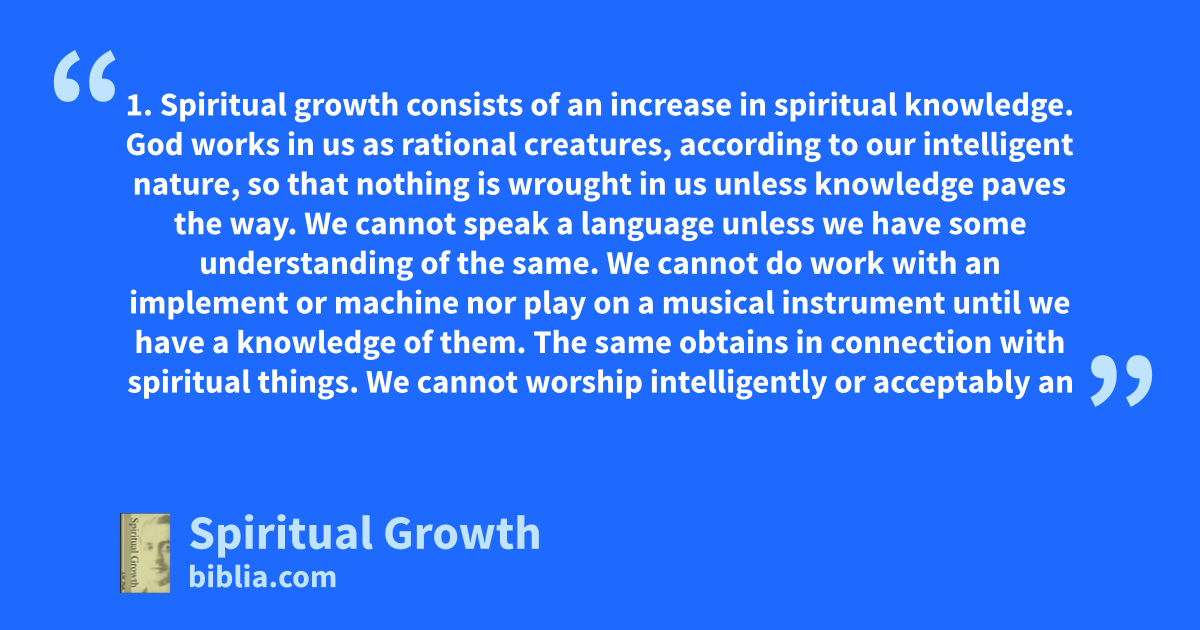 1. Spiritual growth consists of an increase in spiritual knowledge. God works in us as rational creatures, according to our intelligent nature, so that nothing is wrought in us unless knowledge paves the way. We cannot speak a language unless we have some understanding of the same. We cannot do work with an implement or machine nor play on a musical instrument until we have a knowledge of them. The same obtains in connection with spiritual things. We cannot worship intelligently or acceptably an